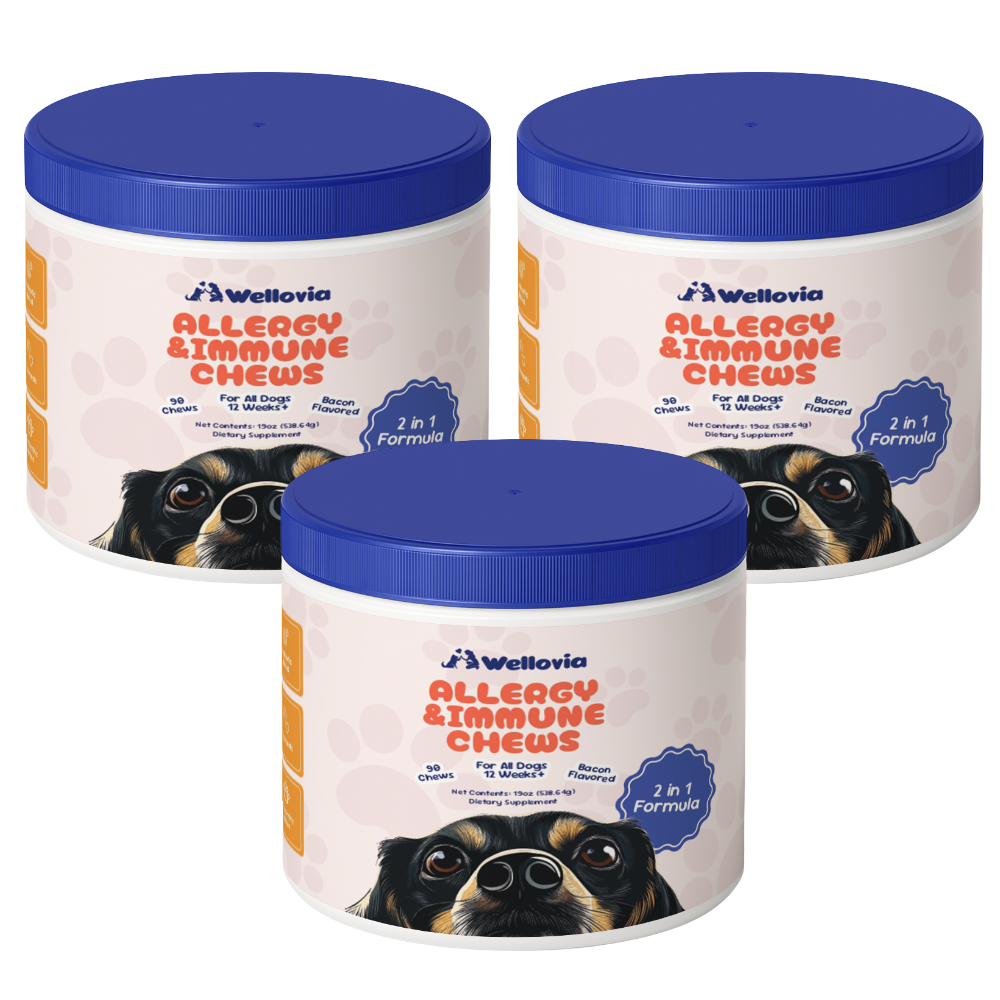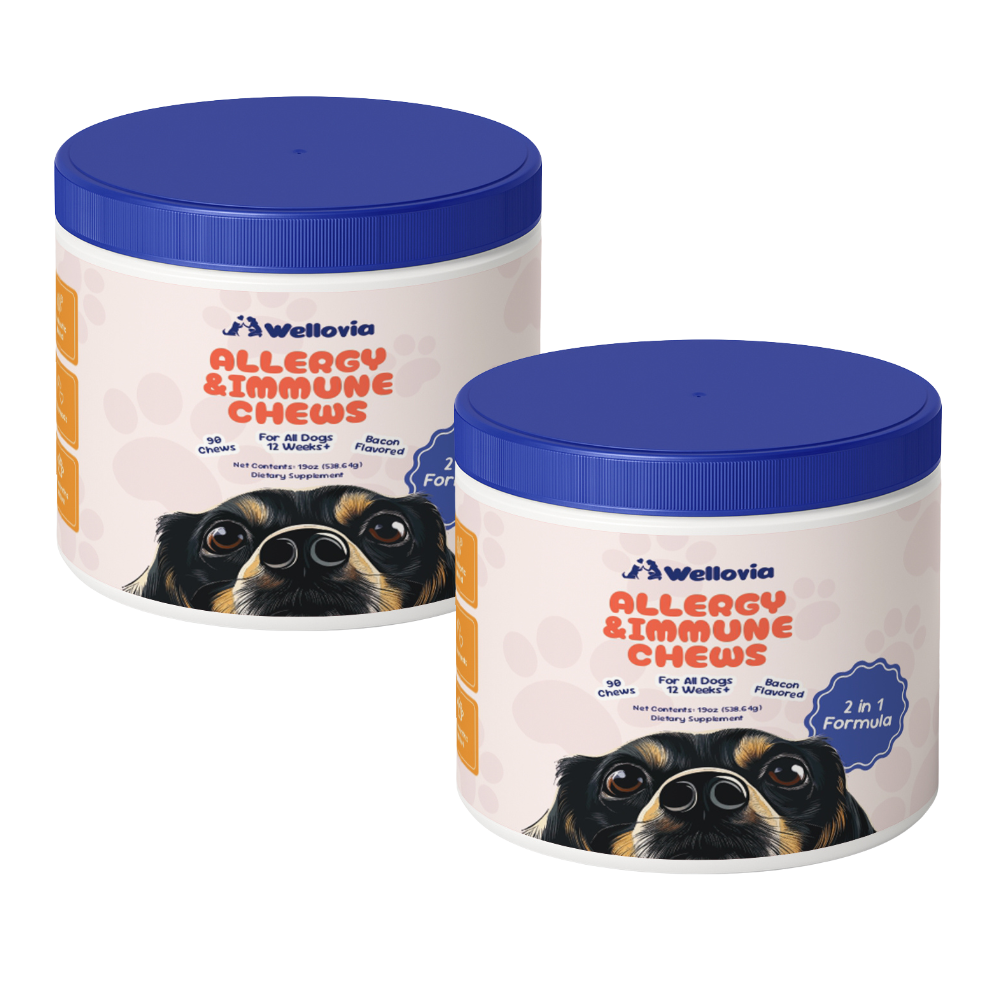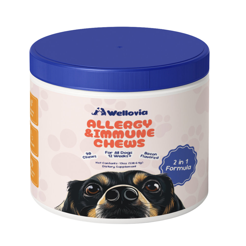 Wellovia Allergy & Immune Chews are specially formulated to support your dog’s immune system, reduce allergy-related itching, and promote healthy skin and coat.